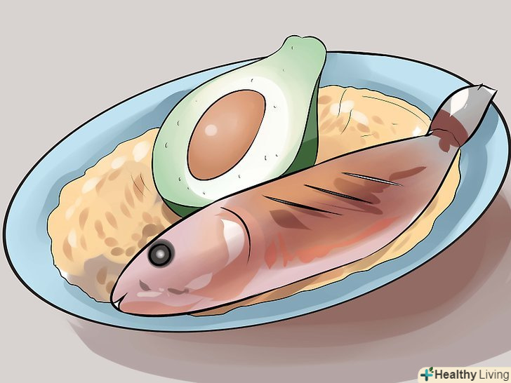 Їжте корисні жири.багато видів риби, в тому числі лосось, багаті жирними кислотами омега-3, які так важливі для роботи мозку. Ці кислоти зменшують запалення. Намагайтеся вживати по 120 г 2-3 рази на тиждень.[26] Авокадо-це теж хороше джерело корисних жирів, які допомагають знизити кров'яний тиск і покращує кровообіг в цілому.[27]
