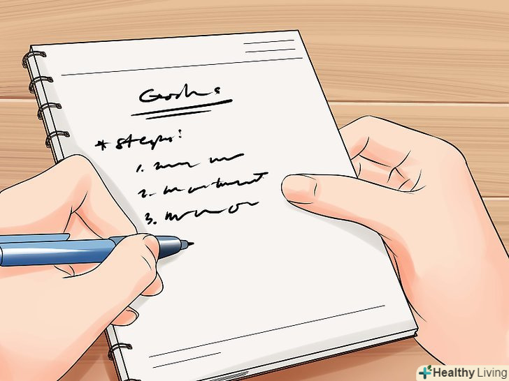 Ставте перед собою короткострокові цілі.розділяючи цілі на невеликі кроки, ви підвищите ймовірність їх досягнення. Досягнення короткострокових цілей допоможе вам зберігати мотивацію на шляху до підкорення довгострокових цілей. [7].- Випишіть короткострокові цілі в щоденник. Використовуйте щоденник, щоб нести відповідальність за досягнення короткострокових цілей.