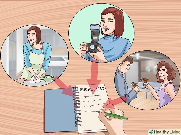- Впишіть в список місця, які ви хотіли б відвідати і побачити, заняття, цілі, людей, з якими ви хотіли б познайомитися, нові переживання, навички, завдання в сфері здоров'я, фінансів і так далі, а також те, що ви хотіли б сказати певним людям, і людей, яких би ви хотіли подякувати.[8]