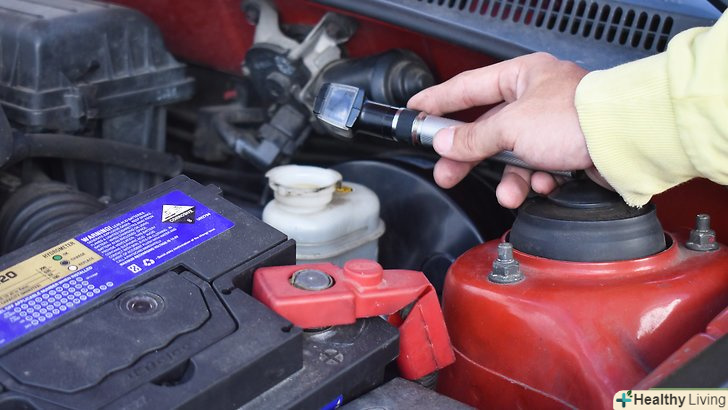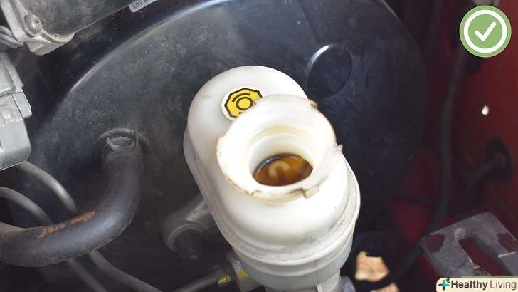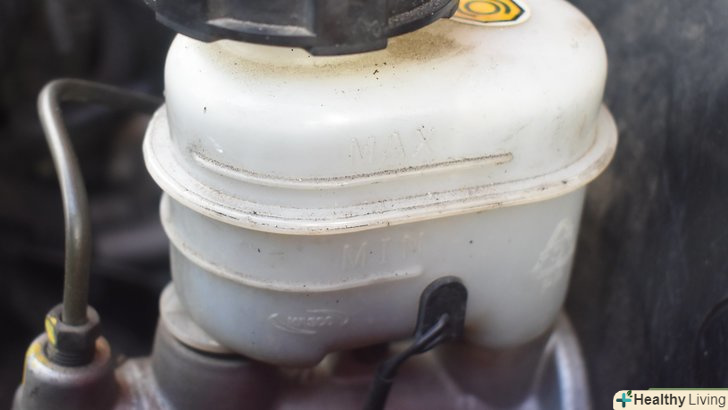 Перевірте рівень рідини в резервуарі.у більшості сучасних машин цей резервуар прозорий, крім того, на нього нанесені позначки "Min" і "Max"; рівень рідини повинен бути десь посередині між ними. У машинах, які були зібрані до 1980-х, цей резервуар може бути металевим, так що вам доведеться зняти кришку бака. (Більш нові кришки прикручуються і відкручуються, в разі більш старої машини вам доведеться скористатися викруткою.)- При необхідності долийте в резервуар гальмівної рідини.Доливайте рідину акуратно, якщо щось проллється-відразу витирайте! Гальмівна рідина токсична і викликає корозію.
