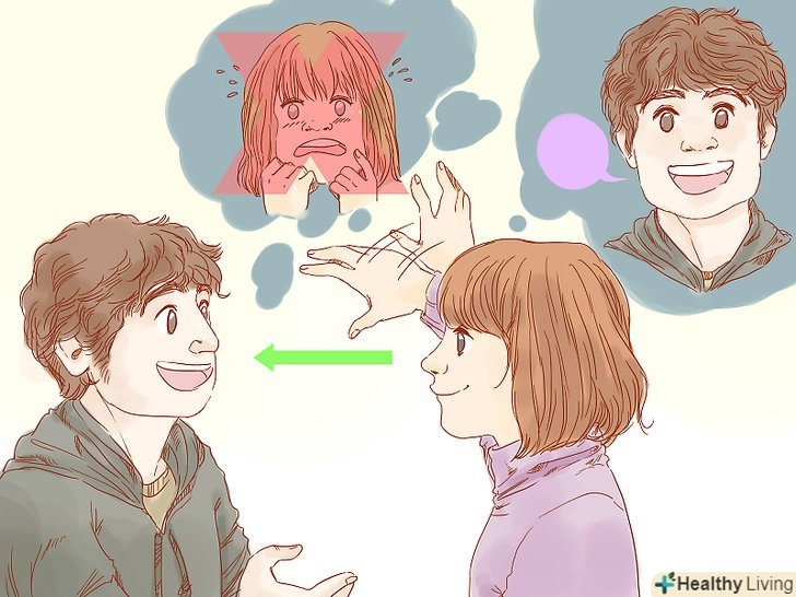 Направляйте увагу назовні, а не всередину.це один з найважливіших аспектів сором'язливості та соціальної тривожності. Більшість боязких людей роблять це ненавмисно, але часто починають притягувати до себе увагу під час розмови. В результаті людина поглинена самим собою і знову починається замкнуте коло думок. Дослідники дійшли висновку, що цей факт може бути головною причиною нападів паніки після моментів помірної тривожності.[3]- Навчіться спокійніше сприймати свої недоліки і не зациклюйтеся на сором'язливості або недоречно вимовленому слові. Спробуйте віджартуватися і не привертайте уваги до того, що Ви порахували недоліком. Більшість людей проявлять співчуття-відчути загальнолюдську спорідненість простіше, ніж вам здається.