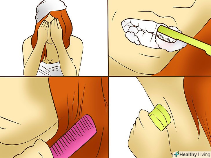 Вмийтеся, почистіть зуби, причешіть волосся і скористайтеся дезодорантом.також можете нанести косметику, якщо це має місце, але будьте обережні і швидкі.