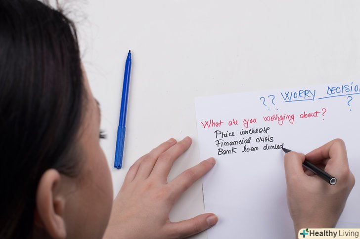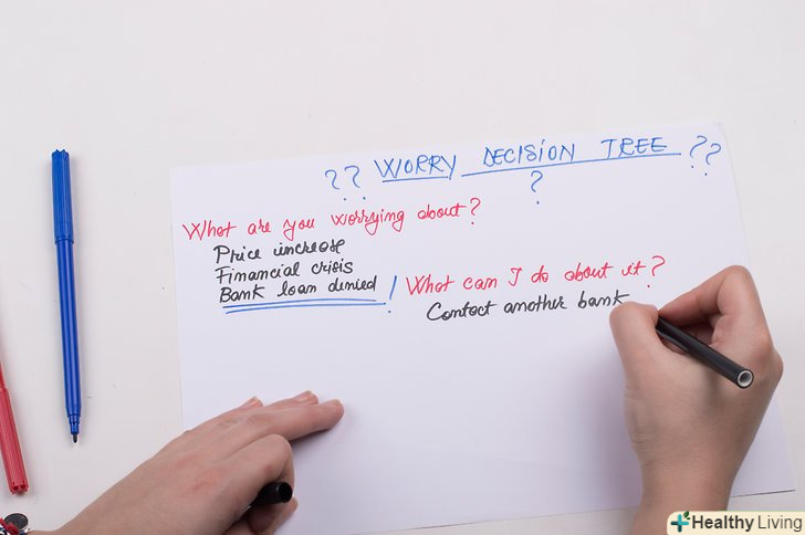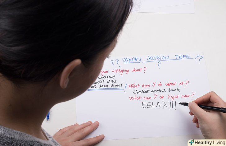 Зрозумійте суть дерева хвилюючих рішень.такий метод дозволяє розпізнати характер свого хвилювання, перетворити занепокоєння в розв'язувану проблему і визначити, коли можна безпечно відпустити хвилювання. Існує два типи ситуацій, через які немає сенсу турбуватися: ситуації, в яких можна щось зробити, і ситуації, в яких нічого зробити не можна.[7]- Використовуйте дерево хвилюючих рішень, щоб проаналізувати своє занепокоєння. Якщо нічого не можна вдіяти, можна перестати турбуватися. Спробуйте відволіктися, якщо вам складно не хвилюватися.