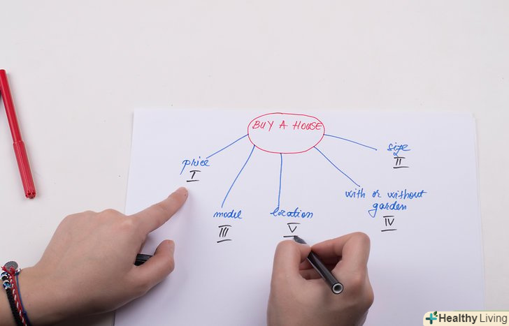 Визначте пріоритетність змінних.Подумайте, які аспекти мають для вас найбільшу важливість, щоб записати їх по порядку (від найважливішого до найменш важливого). Залежно від типу рішення, яке потрібно прийняти, змінні можна розташувати в хронологічному або пріоритетному порядку (або використовувати обидва підходи).[3]- При покупці простого автомобіля для роботи пріоритетність гілок дерева рішень може мати наступну черговість: ціна, економічність, модель, стиль і комплектація. Якщо ж ви купуєте автомобіль в подарунок для дружини, то черговість може бути інша: стиль, модель, комплектація, ціна і економічність.