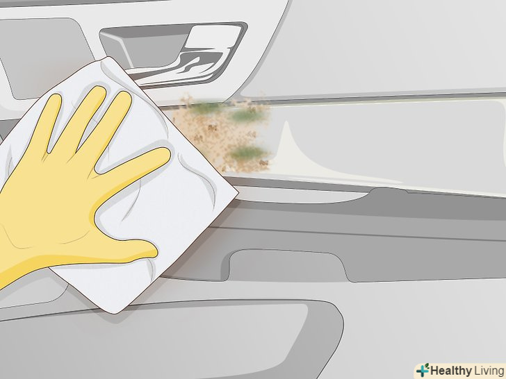 Витріть внутрішні поверхні і видаліть з них плями, які могли викликати неприємний запах.побризкайте на м'яку ганчірку універсальним миючим спреєм і протріть всі пластикові, дерев'яні, скляні та металеві поверхні всередині машини.[6] зверніть увагу на плями і бризки, через які міг з'явитися запах. Наприклад, ваша дитина могла впустити на сидіння тістечко.- ЩобОчистити шкіряні крісла, використовуйте відповідний засіб для чищення шкіри. У магазині товарів для автомобілів можна також придбати спеціальний засіб для чищення шкіряних крісел.