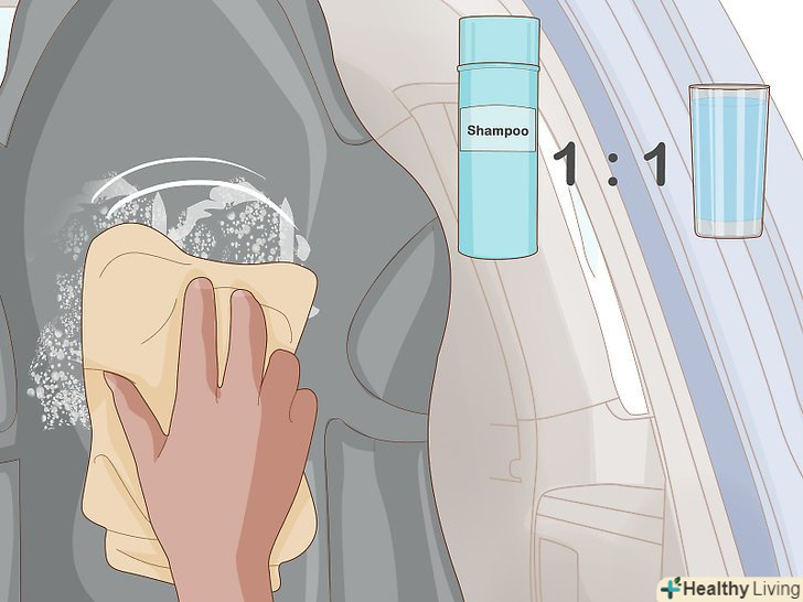Якщо вам не вдалося позбутися неприємного запаху за допомогою пилососа, помийте салон шампунем.якщо запах залишився після того, як ви пропилососили підлогу і крісла, будуть потрібні більш сильні засоби, щоб очистити салон. Придбайте в магазині автомобільних товарів шампунь для мийки салону і протріть їм поверхні за допомогою губки. Розведіть шампунь водою відповідно до вказівок на упаковці. Як слід протріть шампунемоббивку і підлогу, щоб видалити в'ївся бруд.[9]- Ретельно розтирайте шампунь по забруднених місцях на підлозі і кріслах. Плями бруду можуть викликати неприємний запах, тому слід видалити їх.