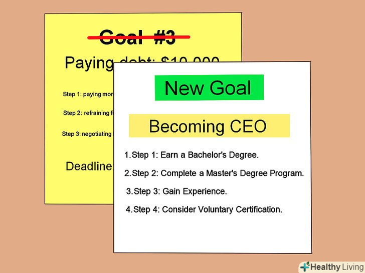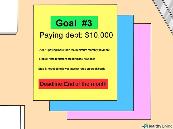 Ставте реальні цілі .[7] коли ви будете знати, які аспекти потрібно поліпшити, починайте ставити цілі. Візьміть ручку і блокнот. Озаглавте кожну сторінку конкретною метою-особистою і професійною. Потім напишіть кілька практичних дій, які необхідно зробити. Нарешті, визначте розумний крайній термін, який цілком реальний, але буде вас підстьобувати.- Наприклад, ви поставили мету виплатити борг. Ця мета може задіяти кілька різних стратегій-оплата в обсязі, що перевищує мінімальний щомісячний платіж, спроби не накопичувати нові борги і переговори щодо зниження облікових ставок по кредитних картах або поновлюваних рахунках.