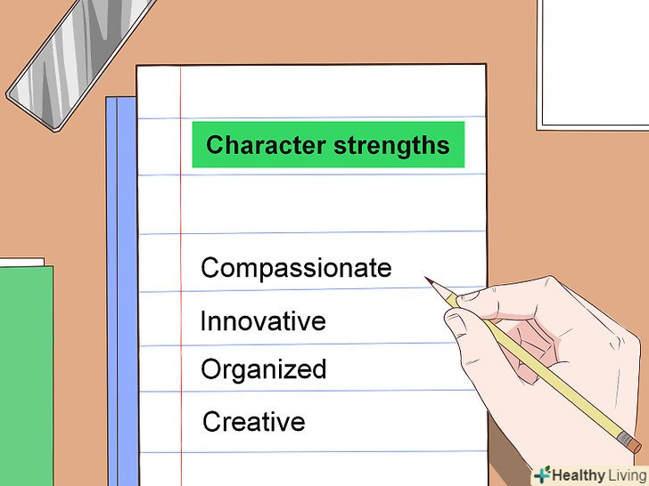 Запишіть сильні якості характеру, які ви розглянули в майбутній версії себе.вирішіть, які властивості вам потрібно розвинути, щоб досягти такого результату.- Наприклад, ваша майбутня особистість може відрізнятися підвищеним співчуттям, новаторством і організованістю. Такі навички можна продемонструвати в комерційному підприємстві. Які сторони вам потрібно розвивати, щоб досягти наміченого результату?[3]