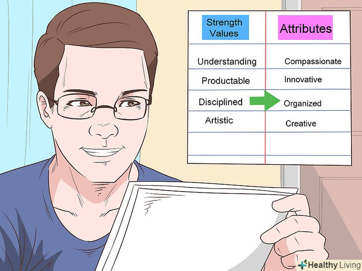 Підведіть підсумки.[5] вивчіть інформацію, отриману завдяки вправі " краща версія мене» і думку інших. Які Ваші майбутні якості вже присутні, а які ще потрібно розвивати? Складіть список своїх сильних сторін, а потім аналогічний список якостей, над якими потрібно попрацювати, щоб змінити себе відповідно до наміченої мети.