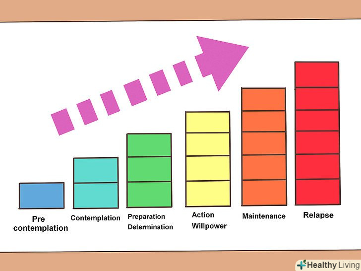Запасіться терпінням.прогрес - це не безперешкодний рух по прямій лінії. Замість цього вам доведеться стикатися з повтореннями пройденого, короткими шляхами, поворотами не туди, періодами поневірянь і тимчасового застою. Потрібно зрозуміти, що зміни не відбуваються в одну мить. Ознайомтеся з етапами змін, щоб усвідомити, що навіть невеликий крок вперед-це вже прогрес.[6]- Попередні роздуми. На даному етапі ви ще не готові прийняти необхідність змін (заперечення). Ви можете захищати свої погані звички, на які вкажуть люди.