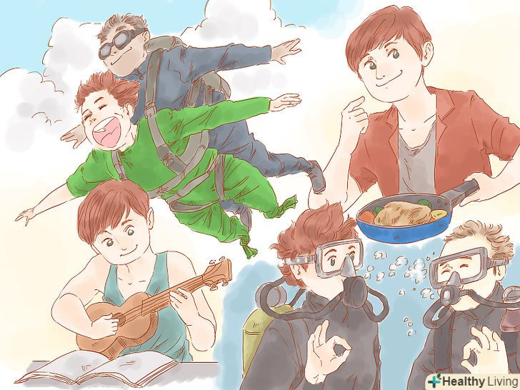 Беріться за складні завдання. Успіхи у важких справах надають впевненості. Навіть якщо у вас не вийде освоїти справу на льоту, то сприймайте складності як досвід і нагадуйте собі, що у вас є стільки часу на навчання, скільки буде потрібно.[29]- Наприклад, можна поставити мету навчитися грати на гітарі, готувати як шеф-кухар, плавати під водою з аквалангом — все залежить тільки від вашої уяви.