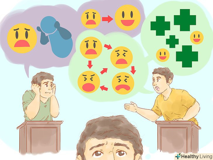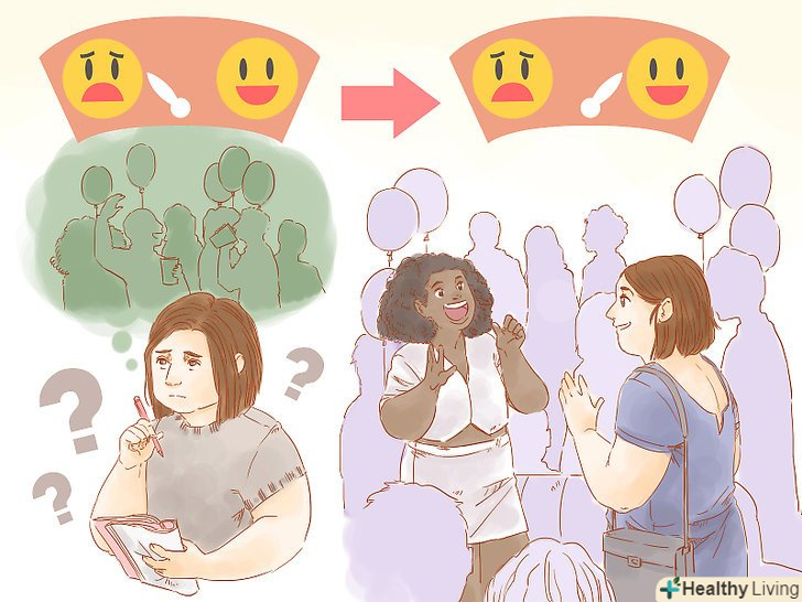 Не піддавайтеся негативним думкам.всі ми час від часу може загрузнути в шкідливих для себе думках або «когнітивних спотвореннях». Якщо вам лізуть в голову негативні думки про себе або ситуації, то зробіть зусилля і проаналізуйте обгрунтованість таких думок або ж перетворите їх в позитивні ідеї.[16][17]- Поширеним спотворенням є узагальнення. Наприклад «" я така боягузка " - це вкрай узагальнене твердження, яке не є вірним. Людина може відчувати страх, але це не означає, що він «боягуз».