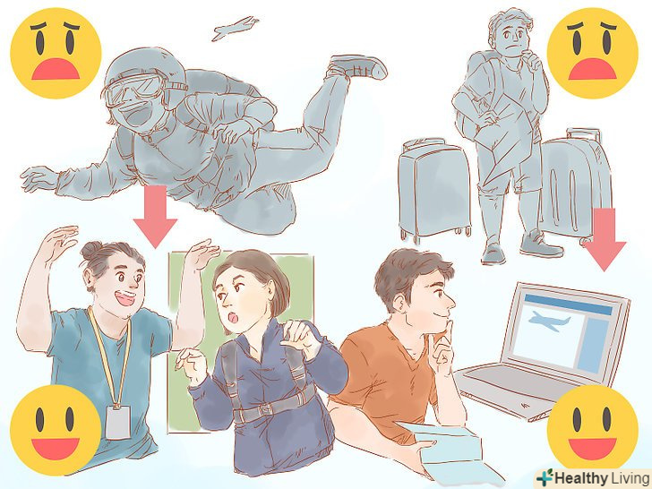 Досліджуйте свої страхи. людина відчуває страх, коли відчуває загрозу або небезпеку для себе або інших. Деякі страхи обгрунтовані, але інші приносять шкоду. Погляньте на свої страхи і визначте, наскільки вони корисні.[6][7]- Наприклад, боятися затяжних стрибків з парашутом при відсутності досвіду цілком розумно. Якщо у вас немає знань і навичок в цій області, то легко отримати травму. При цьому можна записатися на підготовчі заняття і збирати інформацію про стрибки, щоб розібратися зі страхом. На борту літака страх може нагадати про себе, але ви вжили всіх заходів, які були вваших силах.