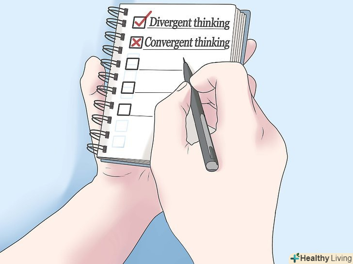 Мислите дивергентно, а не конвергентно.конвергентне мислення означає, що ви бачите тільки два варіанти-біле і чорне, добре і погано, ми і вороги. Дивергентне ж мислення допускає існування куди більш широкого спектру можливостей і варіантів.[2]- Щоб навчитися мислити дивергентно, треба, стикаючись з новими людьми або ситуаціями, звертати увагу на те, як ви сприймаєте це. Чи використовуєте ви лише обмежений набір варіантів (наприклад: він не хоче гуляти зі мною — Він мене ненавидить, він хоче гуляти зі мною — я йому подобаюся)? Чи часто ви використовуєте фрази " або... або"? Піймавши себе на мисленні в такому ключі, зупиніться і подумайте: а чи все це варіанти, що є у вас? Як правило, варіантів виявляється істотно більше.