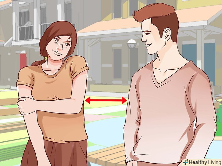 Захистіть свій особистий простір.між вами і вашим співрозмовником має бути невелика відстань, так ви будете здаватися більш сором'язливою. Не стійте занадто далеко від співрозмовника, відстань повинна бути достатньою для того, щоб можна було підтримати розмову і проявити інтерес.- Сядьте поруч зі співрозмовником, покладіть руку на стіл якомога ближче до руки співрозмовника. Це знак того, що ви хотіли б доторкнутися до нього під час розмови, але занадто сором'язливі, щоб зробити перший крок.