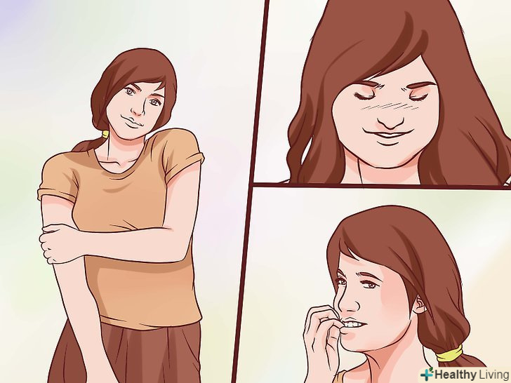 Використовуйте мову тіла, яка характерна для сором'язливих людей.деякі пози і жести можуть натякнути оточуючим, що ви сором'язливі. Як уже згадувалося, намагайтеся уникати зорового контакту. Крім того, використовуйте наступні хитрощі, які створюють враження скромного, сором'язливого людини.[19] Отже, ось кілька прикладів жестів і поз, які потрібно використовувати:- Схрестіть руки або ноги