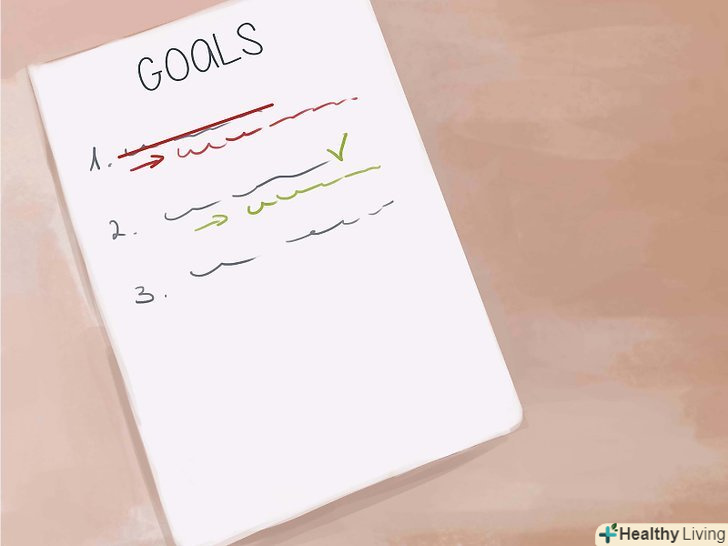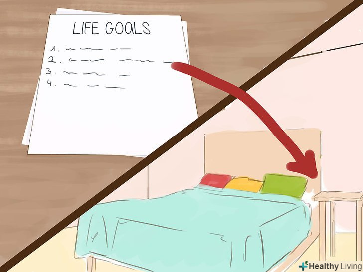 Запишіть свої цілі на папері.коли ви щось записуєте, ви робите це більш ясним і певним.[3] якщо ви хочете здійснити свої бажання, швидше за все, ви вже маєте на увазі якісь цілі. Якщо це не так, то розглядайте відмінність між своєю реальною і ідеальним життям як основу для освіти цілей. Коли ви запишете свої цілі на папері, ви зробите їх відчутними і конкретними. Можете записати стільки цілей, скільки хочете, просто враховуйте свої власні обмеження і не ставте непосильні цілі.- Коли в майбутньому ви будете займатися досягненням цих цілей, корисно було б залишити їх список там, де ви будете бачити його кожен день, наприклад, на холодильнику або поруч з ліжком.