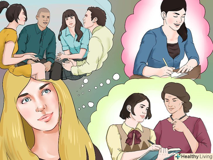 Введіть в звичку позитивні розмови з самим собою.тренуйте мислення фразами, які резонують з вашими внутрішніми відчуттями і викликають позитивні почуття. Думки про себе повинні бути налаштовані на позитивну хвилю і підтверджувати ваші найкращі особисті достоїнства і досягнення.[15]- Подумки розмовляючи з самим собою, використовуйте даний час для побудови фраз, щоб позбутися від занепокоєння про майбутнє за допомогою справжніх позитивних тверджень.