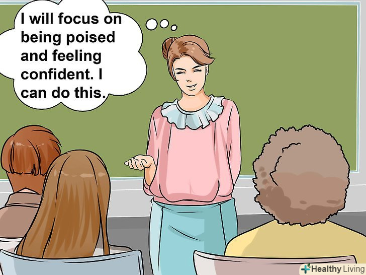 Повірте, що все вийде.в якій би ситуації ви не опинилися, ваше уявлення про неї завжди впливає на кінцевий результат (в кращу або гіршу сторону).[10] Люди, які очікують неприємних подій, надають аналогічний вплив на результат ситуації. Наприклад, якщо ви боїтеся сказати дурість або зробити помилку на зборах, то починаєте нервувати і можете заплутатися у власних словах. Отже, ви самі створюєте небажаний наслідок.- Замість представлення можливих наслідків або гіршого сценарію зосередьтеся на тому, чого ви хочете від ситуації. Замініть думки на кшталт "О ні, сподіваюся, що я не скажу дурість" на свідомий позитивний настрій "я буду говорити чітко і впевнено. Я збережу впевненість в собі і самовладання. Я впораюся". Такі позитивні думки допоможуть вам позбутися від нервозності і підвищать ймовірність бажаного результату.