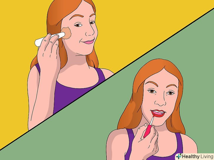 Макіяж: замаскуйте будь – які цятки за допомогою консилера на відтінок світліше природного тону вашої шкіри, а якщо у вас темні кола під очима-нанесіть трохи засобу і туди. Якщо у вас нерівний колір шкіри (є почервоніння, світлі або темні плями і так далі), скористайтеся зволожуючим кремом з пігментами, світлим тональним або BB-кремом. Молодій шкірі BB-крем підійде найкраще, тому що він зволожує, захищає і маскує недосконалості, при цьому ваше обличчя буде виглядати природно, а не ніби його покрили шаром штукатурки. Якщо у вас немає рум'янцю від природи, нанесіть трохи рум'ян самі (тільки не мерехтливих). Скористайтеся праймером (базою) або консилером для повік, щоб макіяж тримався довше – для молодих очей це буде добре. Якщо захочете, нанесіть тіні природного відтінку або підводку. Завийте вію і нафарбуйте їх чорною або коричневою тушшю, тільки не накладіть її занадто багато. Також ніколи не забувайте про крапельку прозорого або кольорового блиску для губ.