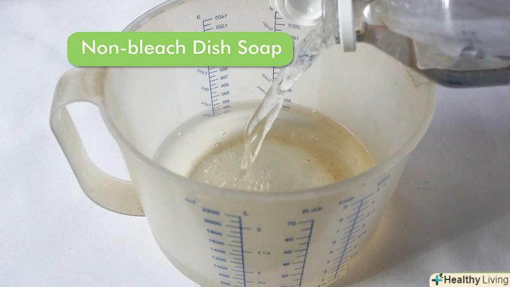 - Змішайте миючий засіб з водою. Візьміть невелику склянку з теплою водою. Додайте трохи (3-4 рази натисніть на дозатор) миючого засобу або універсального миючого засобу. Не використовуйте засіб з відбілювачем або оцтом, так як кислота зашкодить ремінь. Незалежно від походження плям, в більшості випадків їх можна обробляти миючим або миючим засобом. У вас не так багато варіантів для вибору чистячих засобів, тому що деякі з них дуже агресивно діють на матеріал ременя безпеки.[6]