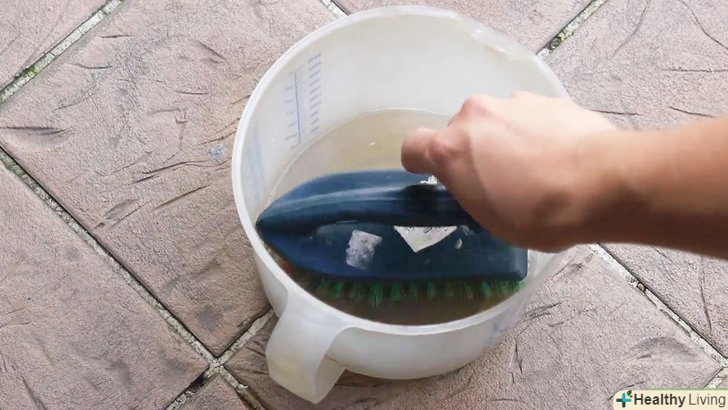 Змішайте миючий засіб у мисці.у чашу (240 мл), наповнену водою, додайте одну столову ложку (15 мл) мила без відбілювача. Додайте дві столові ложки (30 мл) оцту. Ретельно перемішуйте, поки не утвориться мильна піна.[8]- Тріть ремінь.використовуйте щітку з м'якою щетиною, яка дозволить акуратно працювати з очищувачем. Занурте її в мильний розчин і рухайтеся вниз по поверхні ременя. Робіть це обережно без кругових рухів і тільки в одному напрямку. Обережно, щоб не пошкодити волокна ременя, нанесіть тонкий однорідний шар невеликої кількості миючого засобу.[9]
