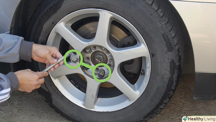 Використовуючи ключ для коліс, відкрутіть болти.ключ для знімання коліс повинен входити в комплект до Вашого автомобіля, як і домкрат, і запасне колесо. Ключ повинен ідеально підходити до болтів на колесах і зазвичай, вам не буде потрібно інший інструмент.- Ключ для коліс може бути прямим або хрестоподібним, такі ключі називають “Хрестовина."Хрестоподібний ключ дозволить вам розвинути більше зусилля, так як ви можете крутити його двома руками.