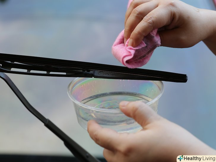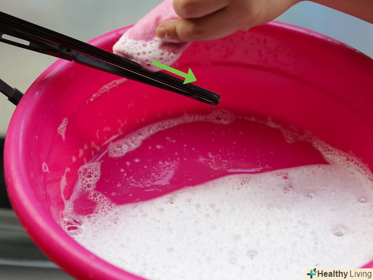 Вимийте Щітки двірників.якщо скло буде чистим, а Щітки двірників залишаться брудними, то на лобовому склі все одно залишатимуться смуги. Акуратно відігніть склоочисники від скла до капота. Наберіть невелике відро води і додайте засіб для миття посуду. Змочіть чисту ганчірку в мильній воді і вичавіть, щоб вона залишилася вологою. Потім протріть двірники м'якими рухами.- Двірники легко переміщаються зі звичайного положення в"положення для очищення". Якщо вони не піддаються, то не тягніть з силою і прочитайте керівництво по експлуатації.