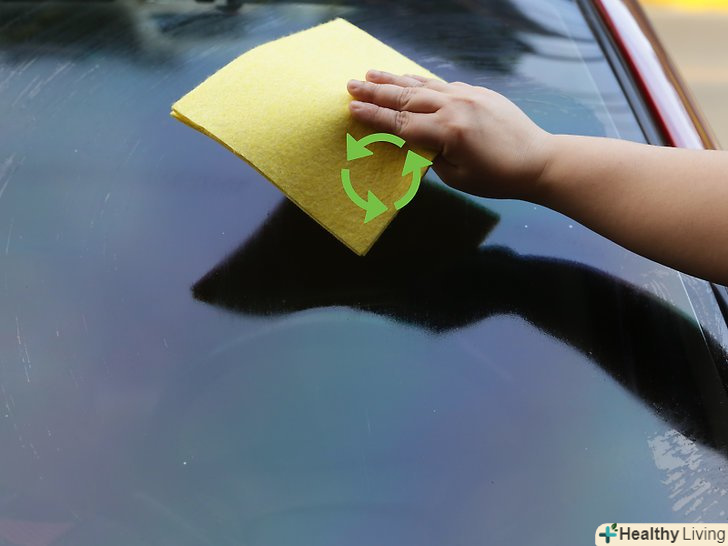 Висушіть лобове скло. Використовуйте нову чисту серветку з мікрофібри. Брудна і навіть випрана серветка може подряпати скло. Насухо протріть лобове скло акуратними круговими рухами. М'яко притискайте серветку до скла, щоб видалити залишилися частинки бруду. Працюйте швидко на невеликих ділянках. Якщо миючий засіб висохне на повітрі, то на склі можуть залишитися смуги.[4]- Якщо у вас немає серветки з мікрофібри, використовуйте зім'яті газети. Газетний папір не залишає ворсинок, а чорнило дозволяють відполірувати скло до блиску.[5]