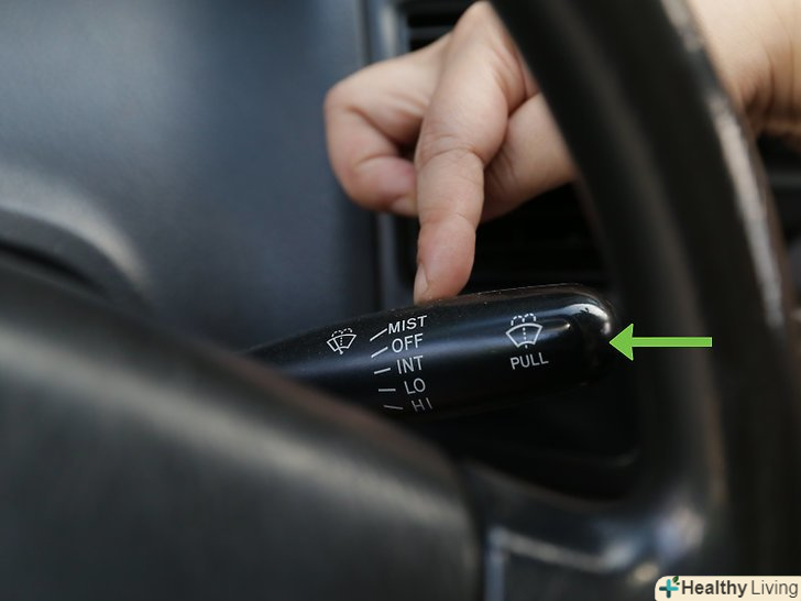 Під час їзди використовуйте рідину для склоомивача.самі по собі двірники не здатні видалити бруд з лобового скла. Бруд і плями можуть небезпечно обмежувати видимість. Прочитайте керівництво по експлуатації автомобіля і навчитеся використовувати двірники з рідиною для склоомивача.[7]- Найчастіше двірники включаються спеціальним важелем під рульовим колесом. Перемістіть важіль до себе, щоб розпорошити рідину на лобове скло.