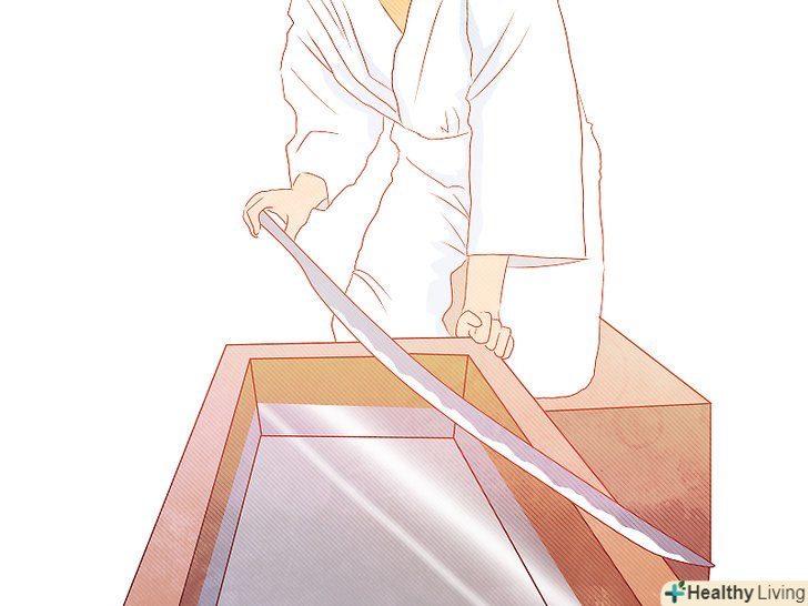 Обробіть клинок спеціальною глиною.у глину можна додавати інші інгредієнти, такі як пір'я або траву. Нанесіть глину на спину клинка, залишивши кромку не покритою. Потім, помістіть клинок в піч. Глина допоможе залишитися спині пластичної, а кромці твердої