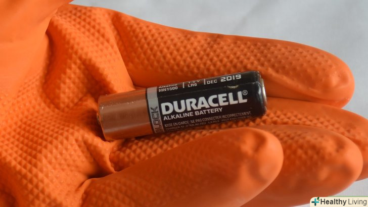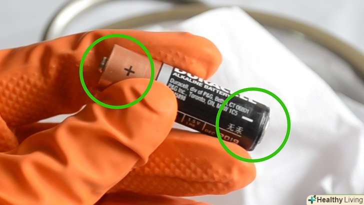 Знайдіть позитивну і негативну клеми батарейки.на більшості батарейок вони позначені. На елементах AA і інших циліндричних батарейках позитивний (+) вихід, або катод, має вигляд невеликого горбка, а негативний (-) вихід (анод) виглядає як увігнута виїмка, яка за формою відповідає позитивній клемі.