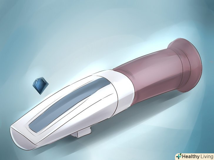 Визначте показник заломлення.це можна зробити за допомогою рефрактометра. За допомогою даного приладу ви зможете виміряти кут заломлення світла при його проходженні через камінь. Кожен дорогоцінний камінь характеризується своїм кутом заломлення, тому визначення значення цього кута дозволить вам з'ясувати, який саме камінь перед вами.- Помістіть невелику краплю спеціальної рідини на металеву поверхню рефрактометра поблизу задньої частини напівциліндра (віконця, на якому буде поміщений камінь).