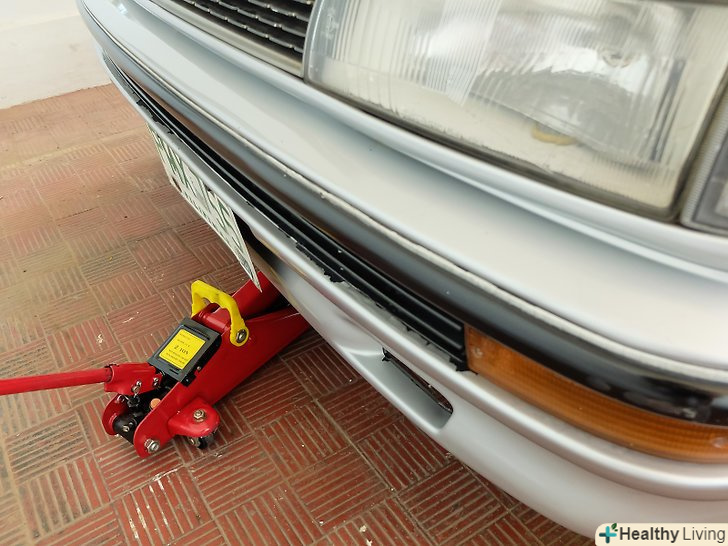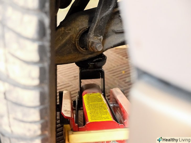 Підніміть передню частину автомобіля.у деяких випадках, виробник рекомендує вам поставити домкрат під нижній поперечний важіль переднього колеса якомога ближче до кульової опори, потім підніміть машину на рівень, щоб колеса не торкалися землі. Якщо ви не зробите цього то, коли ви будете піддомкрачувати автомобіль, кульовий шарнір все ще буде в напрузі, внаслідок чого буде важко його посунути і перевірити люфт в важелі.- Переконайтеся, що немає компресії в підвісцікомпрессии, коли ви перевіряєте кульовий шарнір. Якщо у вас є важелі управління нерівної довжини, переконайтеся, що верхній відбійник не торкається важеля.
