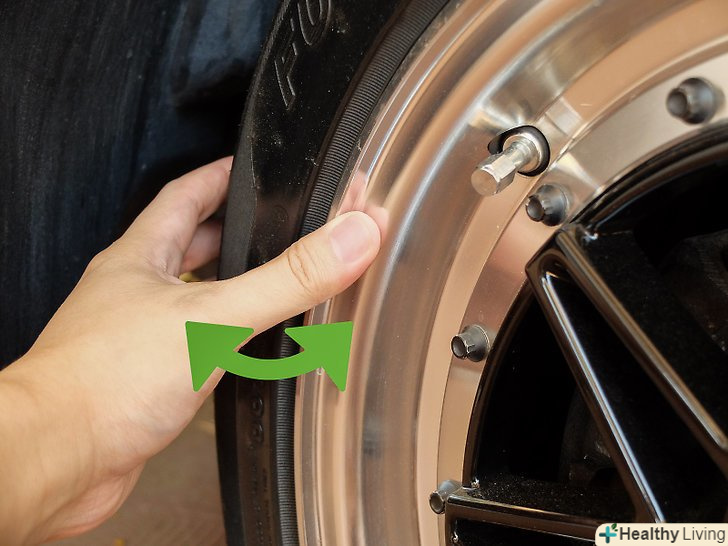Покачайте колеса і перевірте люфт.переконайтеся, що ваш автомобіль надійно встановлений за допомогою домкрата, бажано на підпорах. Для перевірки люфту бік в бік, помістіть стрілочний індикатор всередині обода колеса поруч з кульовою опорою. Візьміть колесо за обидві сторони (3 і 9 годин), щоб підштовхнути його і витягнути вбік.- Для перевірки вертикального люфту, помістіть стрілочний індикатор проти гайки поворотного кулака або корпусу кульового шарніра, в залежності від виробника. Візьміть колесо вгорі і внизу (12 і 6 годин), щоб підняти його і опустити.[2]