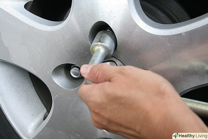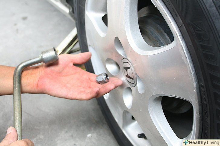 За допомогою накидного ключа послабте гайки, робити це потрібно поки колеса стосуються землі.поверніть ключ проти годинникової стрілки. Спроба відкрутити гайки в піднятому положенні коліс ні до чого не приведуть, оскільки колеса будуть просто обертатися.- Можливо вам доведеться зняти спеціальні ковпачки, якими прикриті гайки. Їх потрібно підчепити і потягнути. Також вам знадобиться зняти ковпаки (якщо є), якими прикриті диски коліс.