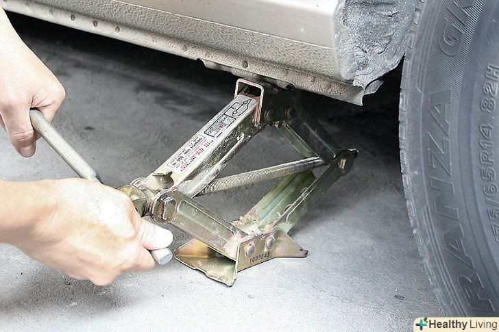 Встановіть домкрат в надійне положення.за допомогою нього підніміть машину, так щоб колесо виявилося на достатній відстані від землі.