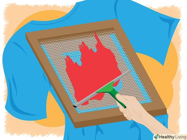 Нанесіть фарбу на сітку.Налийте ложку фарби на верхню частину сітки і рівномірно розмажте її вниз за допомогою гумового валика. Другий раз пройдіться валиком по сітці, тепер уже поперек рами.[4]- На те, щоб навчитися правильно розподіляти фарбу по сітці (і футболці під нею), може знадобитися певний час. Спробуйте навчитися обходитися всього двома рухами валиком: одне вертикальне і одне горизонтальне. Цей спосіб-оптимальний для рівного нанесення достатньої кількості фарби.