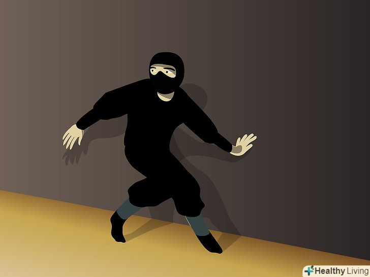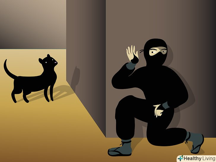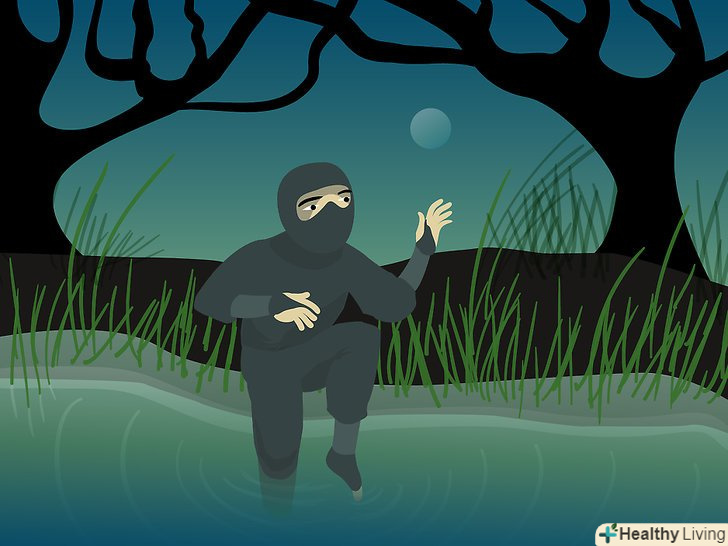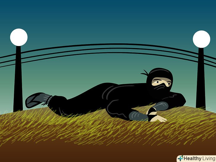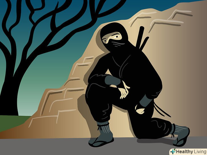 Скритність. для початку, вам знадобиться одяг, відповідна навколишньому середовищу, в якій ви знаходитесь (можливо, в деяких випадках одяг і не знадобиться). Є багато статей, в яких говориться, що одяг ніндзя (сінобі седзоку) повинна щільно прилягати до тіла, щоб не видавати шум. Це помилкова думка, оскільки облягаючий одяг заважає хорошій циркуляції крові, і це може погано позначитися на успіху вашої місії. Крім того, облягаючий одяг видає вас. Камуфляж, навпаки, спотворює вашу форму, щоб вас було важко ідентифікувати як людину. Ваша нічний одяг повинна бути темно-синьою, а також просторою і зручною. Зверніть увагу на кейкогі і хакама. Нижня частина вашої хаками повинна бути заправлена в Табі (взуття ніндзя), і добре затягнута.- Nuki Ashi — позиція випередженої ноги. Це одна з технік Shinobi Aruki (техніки потайного переміщення). Вона дуже корисна при ходьбі по скрипучих підлогах і поверхнях. Займіть позицію полуприсяд з розправленими руками для балансу, і перенесіть вагу на передню ногу. Задню ногу почніть переміщати вперед поруч з іншою ногою, щоб вони ледь торкалися щиколотками. Виставте рухому ногу вперед і використовуйте її для перевірки скрипу підлог. Потім, за допомогою зовнішньої частини стопи, послабте навантаження на вашу ногу. Повторіть дію.
