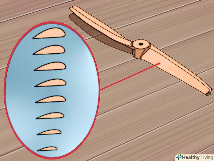 Аеродинамічний профіль. лопать пропелера потовщується біля маточини вала двигуна під великим кутом нахилу, тоді як кінчик лопаті завжди тонкий з невеликим кутом нахилу. [3] визначте ширину лопаті і кут атаки. Лопаті пропелера кріпляться до маточини під кутом аналогічно різьбі на гвинтах і шурупах. [4]