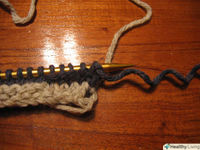 - третій ряд шарфа: для наступного ряду, використовуйте пряжу кольору 2. Після того, як ви зв'яжіть перші кілька петель кольору 2, ви можете прив'язати його вільний кінець, до основної лінії кольору 1. Проте, не варто відрізати пряжу.