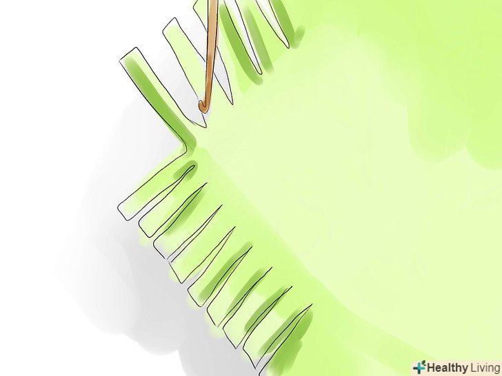 Виберіть шматок бахроми, з якого ви почнете. будь-який шматок підійде. Використовуйте зігнуту скріпку (гачок для в'язання відмінно підійде) і протягніть його через дірку в першій бахромі.- Далі протягніть скріпку через дірку в бахромі, під першою. Вона зачепить другу бахрому, і ви можете протягнути її через першу бахрому.