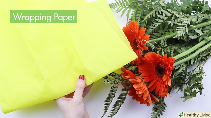 Виберіть обгортковий матеріал. щоб забезпечити підтримку букету з ніжних квітів, можна взяти просту коричневу або іншу щільну обгортковий папір. Якщо у вас букет з квітів з міцними стеблами і міцними бутонами, то можна скористатися більш тонким папером на зразок серветок або газет.- Підберіть такий колір обгортки, який буде добре поєднуватися з вашими квітами, але не затьмарить їх собою. Наприклад, для помаранчевих квітів підійде червона і жовта обгортковий папір, яка допоможе підкреслити руде забарвлення квітів.