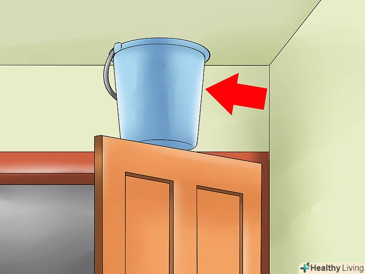 Встановіть на двері відро з холодною водою. наповніть холодною водою відро середніх розмірів. Злегка відкрийте двері. Врівноважте відро на двері, поставивши його зверху на її верхнє ребро. Рівновага вийде хитким, але це саме те, що вам потрібно. Коли непроханий відвідувач відчинить двері, вода виллється йому на голову.