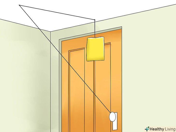 Пастка з липучки для мух. це надзвичайно неприємна і досить ефективна пастка для непрошених гостей. Вам будуть потрібні лише мотузка, цвяхи і лист-липучка для мух з господарського магазину. Відріжте пару метрів мотузки і прив'яжіть один її кінець до дверної ручки (конкретна довжина залежить від відстані від стелі до дверної ручки, мотузки повинно бути приблизно вдвічі більше цього). Вбийте два цвяхи в стелю. Розташуйте перший з них приблизно в 30 см від дверей, а другий — приблизно в 1,5 м.зачепіть мотузку за перший цвях (як на гачок) і починайте кріпити липучку до кінця, що залишився. Чи не обертайте липучку навколо мотузки, а просто приліпите до неї мотузку так, щоб залишалося ще багато липкого місця. Злегка зачепіть кінець мотузки з липучкою за другий цвях. Коли двері відкриється (в напрямку назовні), мотузка з липучкою зісковзне з другого цвяха і маятником хитнеться на першому цвяху прямо в обличчя людини, яка відкрила двері. [4]