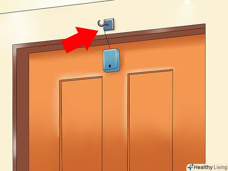 Прикрутіть невеликий гачок зверху до дверної коробки і зачепіть за нього другий кінець дроту. другий кінець дроту необхідно зачепити за гачок над дверима. Таким чином, коли двері відкриється, дріт потягне за кільце на брелоку і включиться сигнал сирени. Переконайтеся в тому, що дріт натягнута досить добре.- Якщо вам потрібно просто дізнатись, чи хтось входив у вашу кімнату, просто закріпіть шматок рибальського дроту вздовж дверей без будь-якої звукової сигналізації. Якщо дріт буде зірвана, ви зрозумієте, що хтось входив у двері.