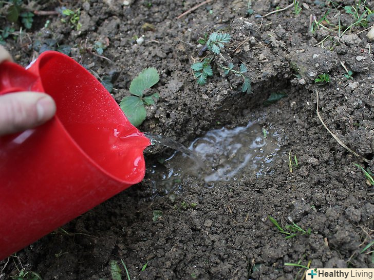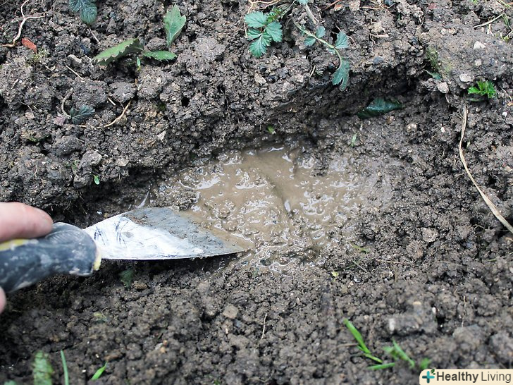 Скористайтеся садовим шлангом або відром, щоб залити скопане місце. час від часу паличкою або рукою помішуйте бруд, що утворюється в грунті, щоб вона вбирала вологу. Продовжуйте паличкою пробувати бруд, до тих пір, поки вона не прийме бажану текстуру.