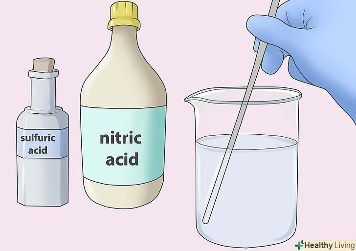 Додайте 22 мл концентрованої сірчаної кислоти в 30 мл паруючої азотної кислоти. змішайте кислоти в скляній мензурці, повільно помішуючи рідину скляними паличками. Суміш почне нагріватися.