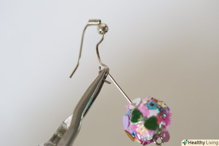 Протягніть один шматок дроту через одну сережку і прикріпіть її до застібки. Тримайте загорнуту частину дроту і протягніть пряму частину через створену в сережці дірку. Як тільки ви проштовхнете її повністю, зігніть її навколо маленької дірки на підставі сережки, щоб вона прикріпилася до застібки, одночасно тримаючи міцно сережку на місці.