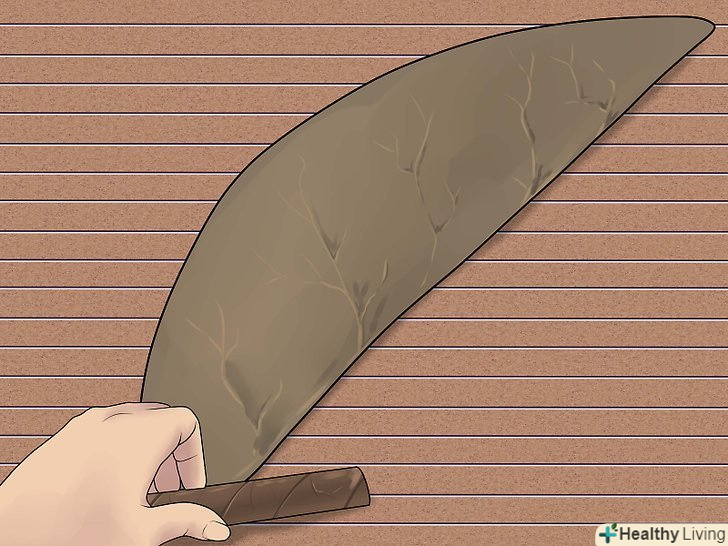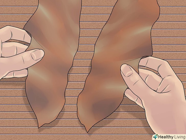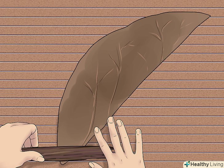 Виріжте з покривних листя центральні прожилки. [2] ці прожилки проходять посередині листя від стебла до верхівки. Розрізавши листя вертикально по обидва боки центральної прожилки, ви отримаєте рівні половинки, з яких складеться оболонка сигари.- При бажанні можна ще більше розгладити покривні листя, злегка пройшовшись по ним теплою праскою або качалкою. [3]